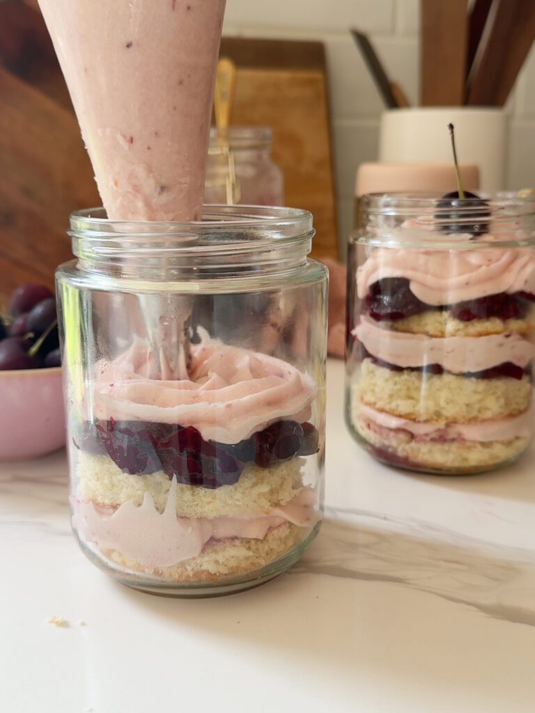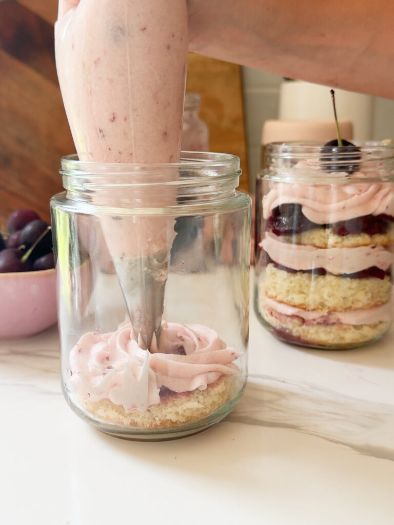 - Layer up: place a layer of cake, then cherry syrup, then the cherry 'jam' (either store bought, or if you made syrup, use the remaining jammy cherries here), then pipe on the buttercream frosting. Repeat until the jars are full!