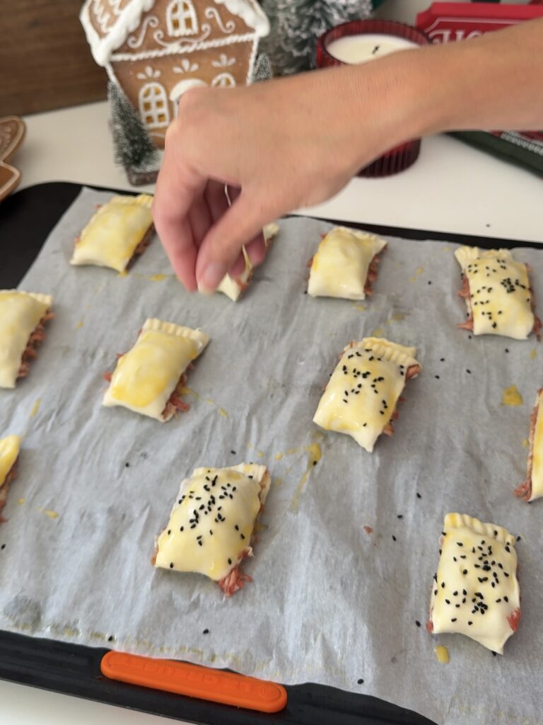 - Working quickly: Place the cold sausage rolls across both baking trays (allowing some space for spreading). Brush with the beaten egg and scatter over some Nigella seeds, sesame seeds, or fresh sage leaves.