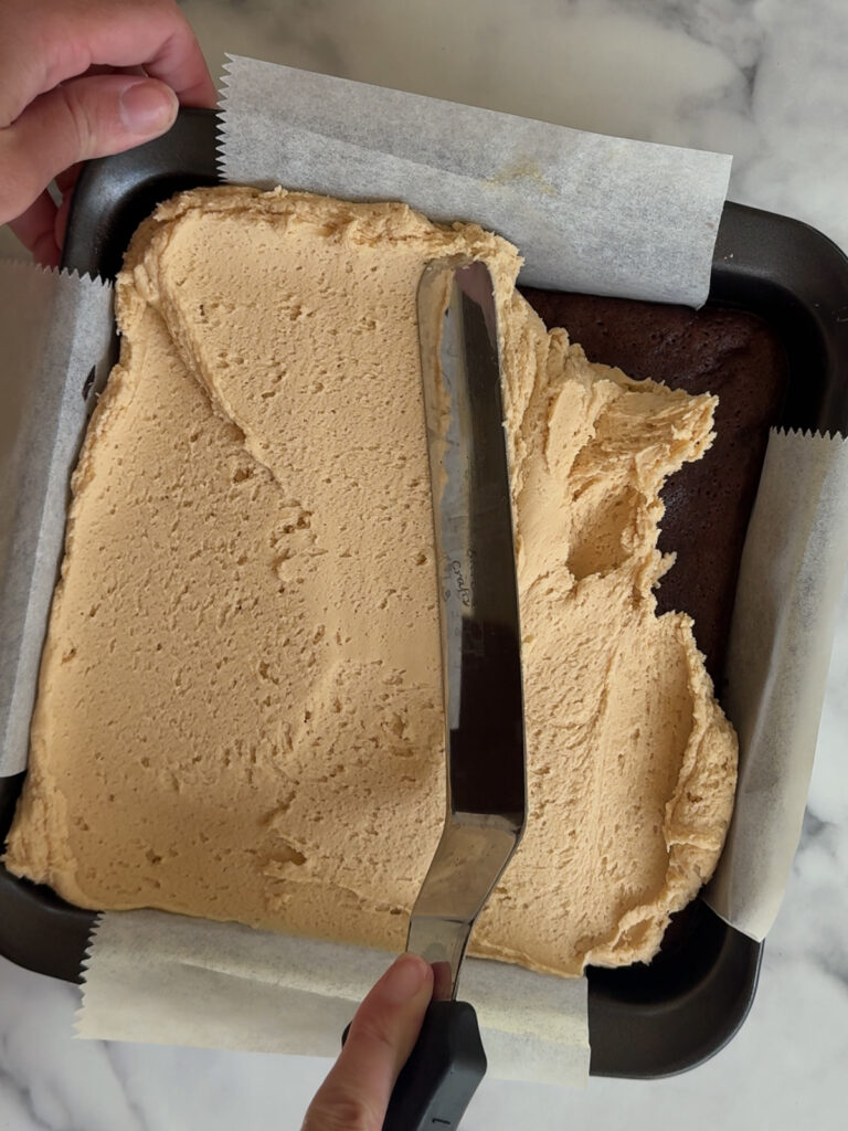 - Spread over the cooled brownies. Put the brownies in the refrigerator while working the next step.