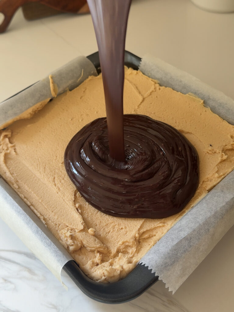 The recipe starts with my classic brownie base, which gets a thick layer of peanut butter frosting before topping with chocolate ganache. I know a lot of people worry about making ganache but it sounds far more complex than it is. All you need to do is warm some cream and pour it over chocolate/chocolate chips. Let it sit for a minute or two then whisk together for that super shiny result. Pour it over the brownies before piping on those famous looping swirls!Â