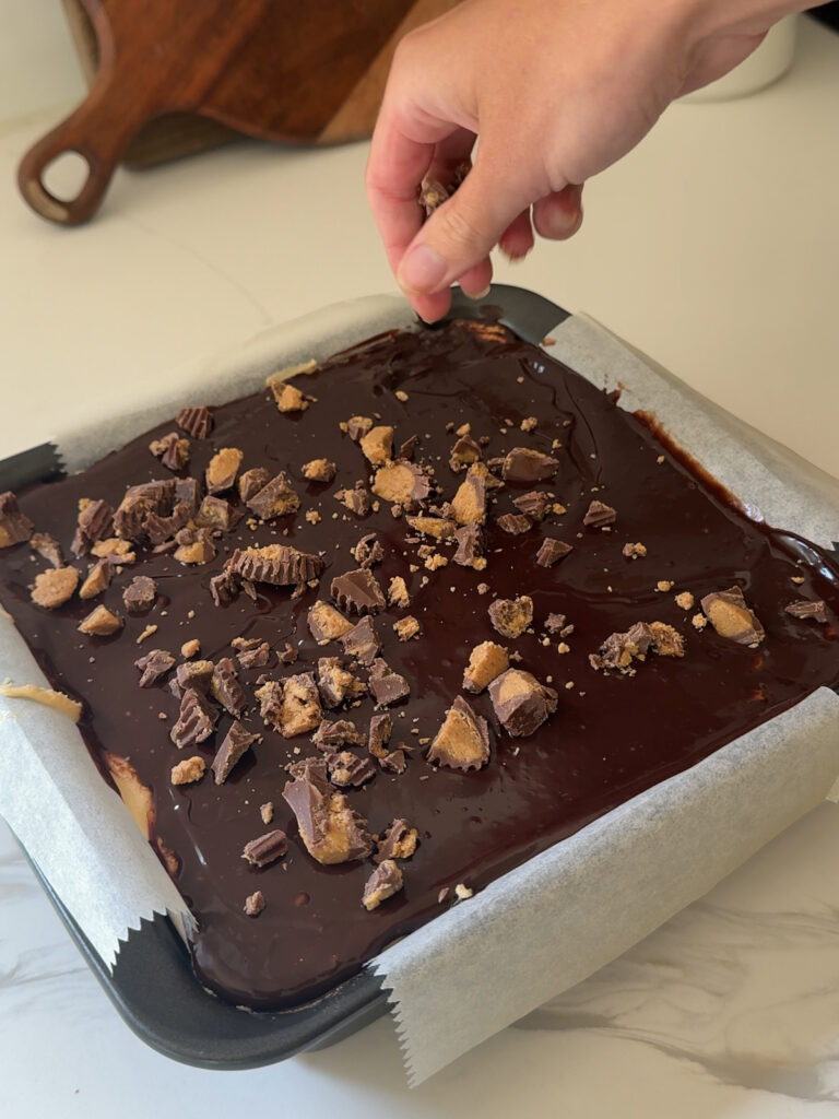 - Optional: decorate with peanut butter candies/chocolate – do this while the ganache is still wet so that they stick in place! Let cool in the refrigerator (and keep stored there). Slice and serve when the ganache is set (whenever it can be sliced!).