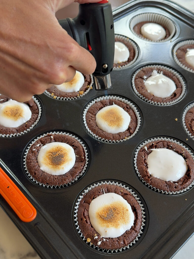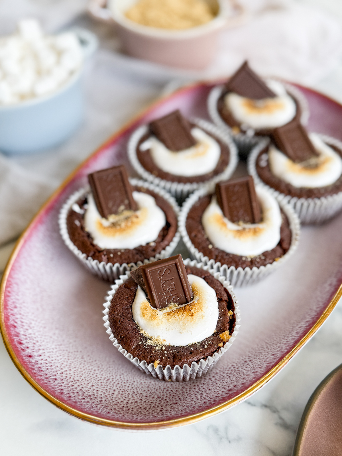 This recipe starts with my classic brownie base, keeping everything fudgy and chocolatey. A little indent or ‘well’ is created in each brownie cup, which gets filled with a graham cracker mixture. Top with a good scoop of marshmallow fluff, then toast with a blowtorch. Finally decorate with little chocolate pieces and a dusting of graham crackers.
