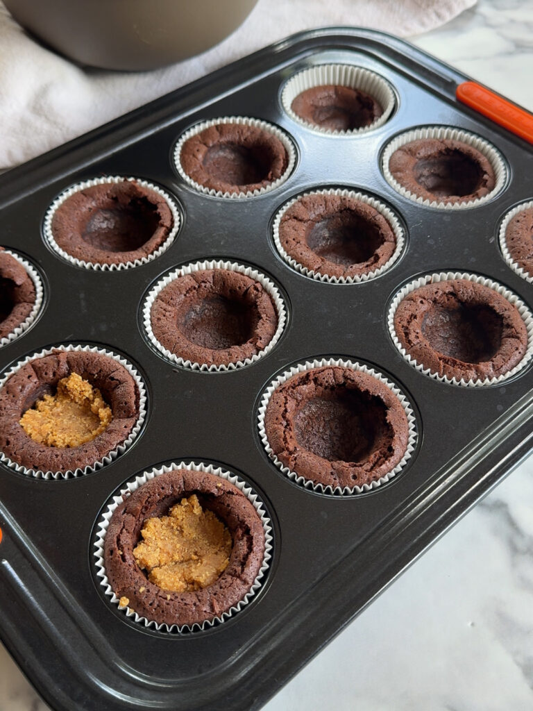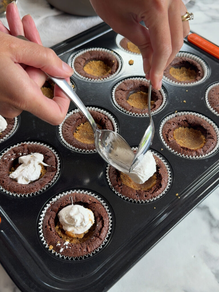 - Graham Cracker Filling: The base of this indent in the brownie cups comprises of a graham cracker/butter mixture. Melt the butter, combine with graham cracker crumbs and spoon in. Press down with a spoon/fingers.