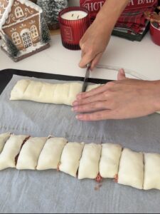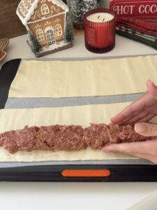 Divide the sausage mixture in half. Take one half of this mixture, and create a 'long sausage' along the length of a sheet of puff pastry. Roll the pastry around the sausage and press the pastry together to seal. Slice into 1 inch wide 'rolls'.
